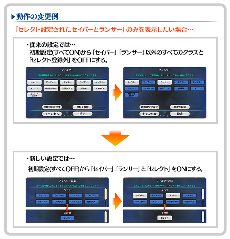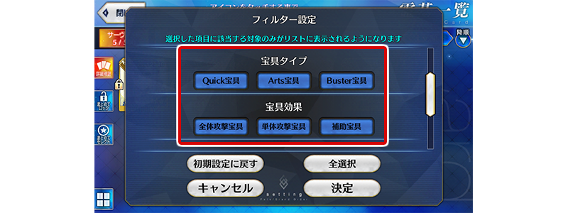 サーヴァントを選択する際のフィルター設定項目に「宝具タイプ」や「宝具効果」を追加いたします。これにより、「Quickで全体攻撃宝具を持つサーヴァントのみを表示する」などのフィルタリングが可能となります。