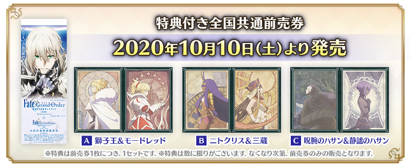 「Fate/Grand Order -神聖円卓領域キャメロット- Wandering; Agateram」第4弾特典付き全国共通前売券が2020年10月10日(土)より発売となります。