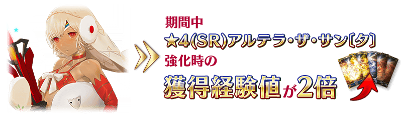 下記の期間中、「★4(SR)アルテラ・ザ・サン〔タ〕」を強化した際の獲得経験値が2倍になります。