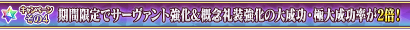 下記の期間中、サーヴァントおよび概念礼装の強化をおこなった際に、大成功(経験値2倍ボーナス)・極大成功(経験値3倍ボーナス)の発生率が期間限定で2倍になります!