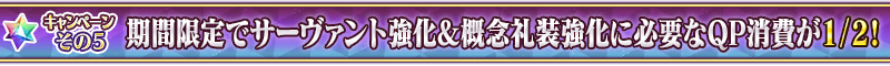 下記の期間中、サーヴァントおよび概念礼装を強化する際に必要なQPの消費量が、期間限定で1/2になります!