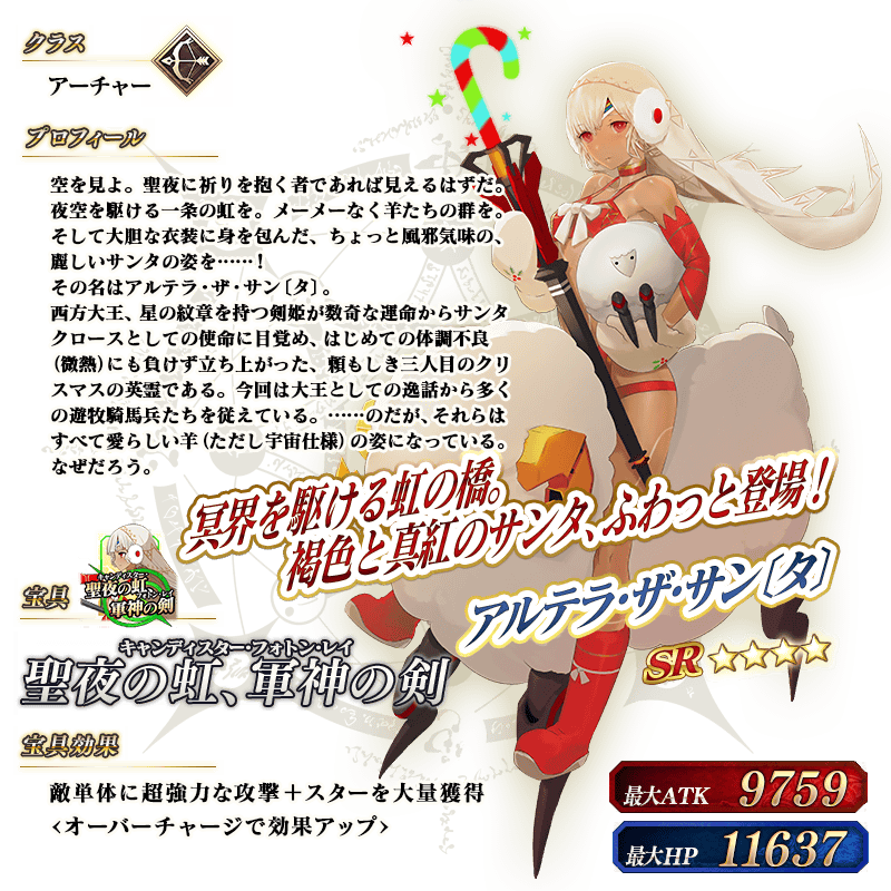「メイン・インタールード 冥界のメリークリスマス」では、メインクエストを進めることで「★4(SR)アルテラ・ザ・サン〔タ〕」が仮加入します。