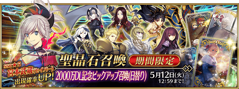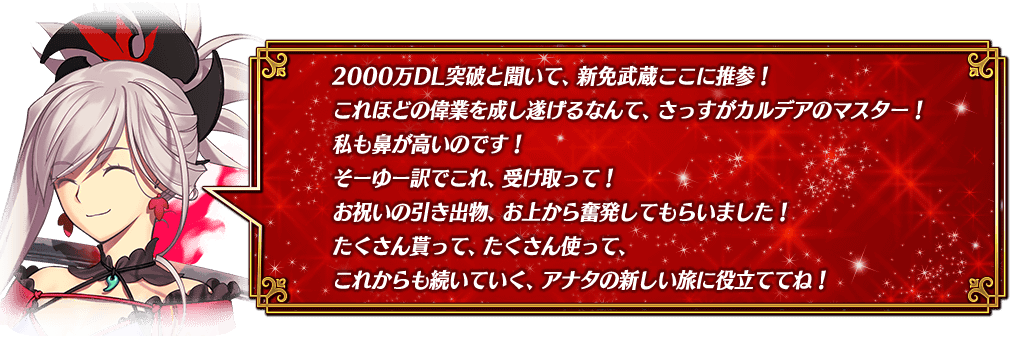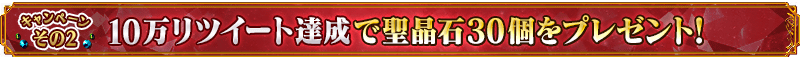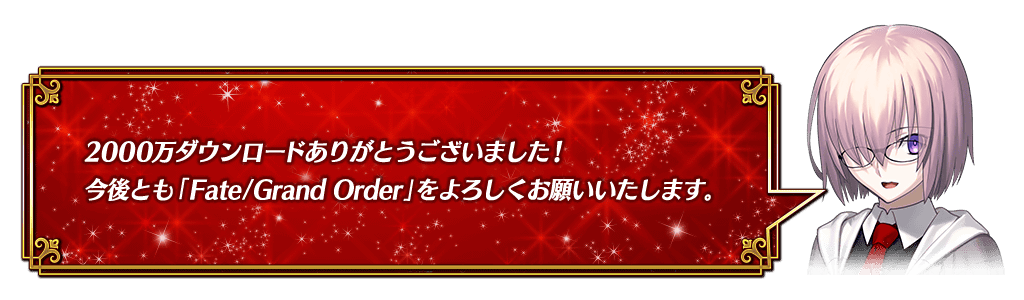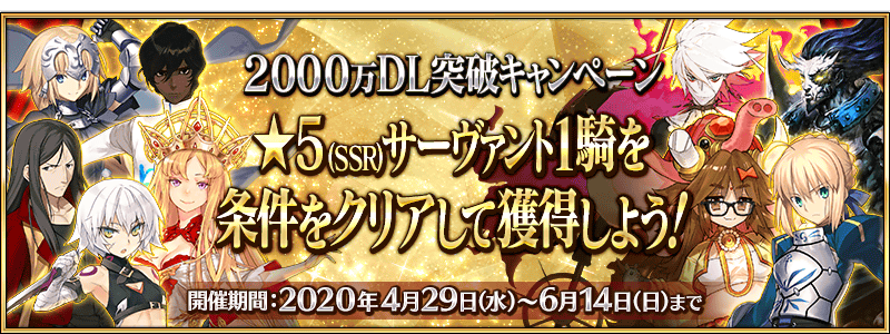 公式ツイッター上で「『2000万DL突破キャンペーン』正式加入条件をクリアして対象の★5サーヴァント1騎を獲得しよう!」ツイートのリツイート数が、下記の期間内で10万リツイートを達成すると、ゲームをプレイしているすべてのマスターに豪華報酬をプレゼント!