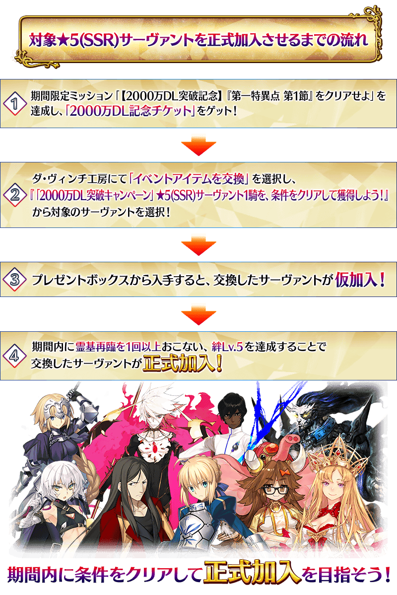 ※「2000万DL記念チケット」で仮加入した★5(SSR)サーヴァントは、6月30日(火) 23:59までに正式加入できなかった場合、離脱してしまいますのであらかじめご注意ください。