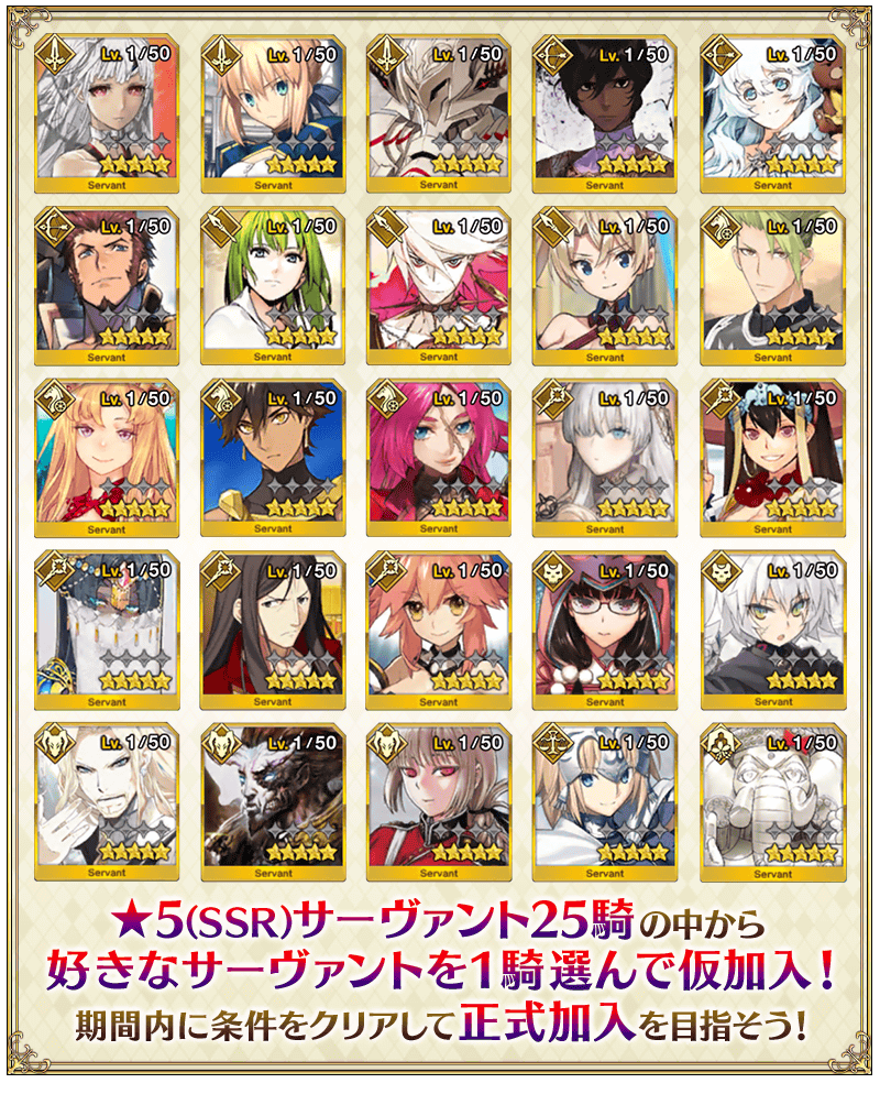 ※すでに入手済みの★5(SSR)サーヴァントを交換した場合、入手済みのサーヴァントが正式加入条件を満たしていれば、交換した★5(SSR)サーヴァントは正式加入状態で入手できます。