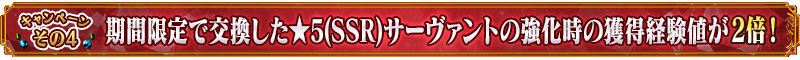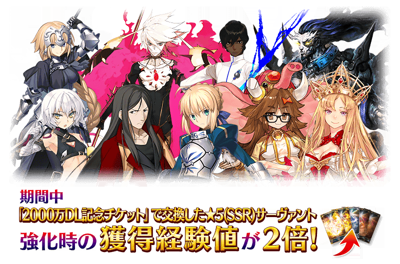 ※現在、「2000万DL記念チケット」で交換した★5(SSR)サーヴァントを強化する際、強化獲得経験値2倍の効果が得られますが、表示上は2倍の獲得経験値表示となっていないため、サーヴァントのレベル上限に達する場合であっても、強化用素材をセットできる状態となっております。このため、本来より強化用素材を必要以上に消費してしまう場合がある不具合が発生しております。