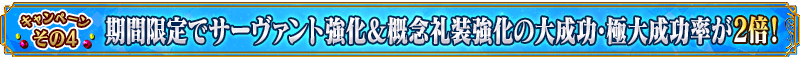 下記の期間中、サーヴァントおよび概念礼装の強化をおこなった際に、大成功(経験値2倍ボーナス)・極大成功(経験値3倍ボーナス)の発生率が期間限定で2倍になります!