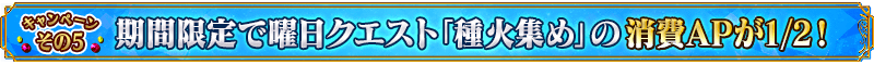 期間限定で、カルデアゲート内に曜日ごとに出現するクエスト「種火集め」の消費APが1/2になります!(バトルにおいて撤退した場合でも、同様の消費量になります)