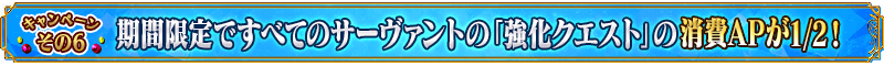 下記の期間中、すべてのサーヴァント強化クエストの消費APが1/2になります!(バトルにおいて撤退した場合でも、同様の消費量になります)