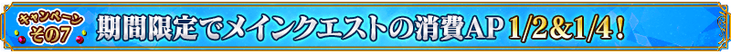 ※現在、永続的にメインクエスト第2部 第5章 アトランティスまでの消費APが1/2になる状態となっています。そのため、キャンペーン終了後、当該メインクエストの消費APは1/2になります。 ※亜種特異点(ⅠからⅣまで)、フリークエストは対象外となりますのでご注意ください。