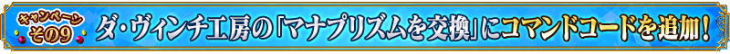 「2100万DL突破キャンペーン」開催を記念して、ダ・ヴィンチ工房の「マナプリズムを交換」に、下記のコマンドコードを恒常追加いたします。