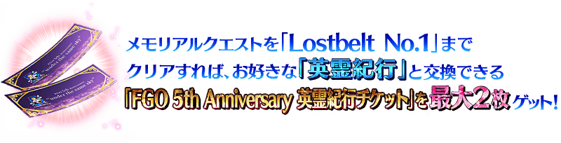 「2015メモリアルクエスト(第一特異点)」と「2018メモリアルクエスト(Lostbelt No.1)」をクリアすると、それぞれ「FGO 5th Anniversary 英霊紀行チケット」を1枚ずつ入手できます。