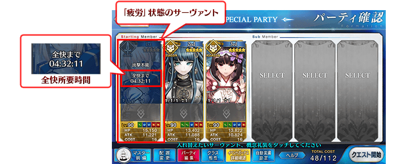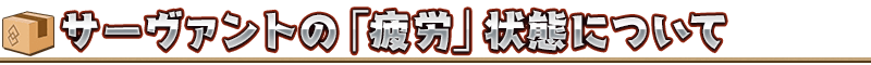 サーヴァントの「疲労」状態は時間が経過することで回復します。アイテムや令呪などによっての回復はおこなえませんのでご注意ください。