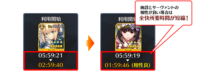 各施設にはサーヴァントとの相性があり、相性が良いサーヴァントを設定した場合、回復時間がさらに短縮されます。