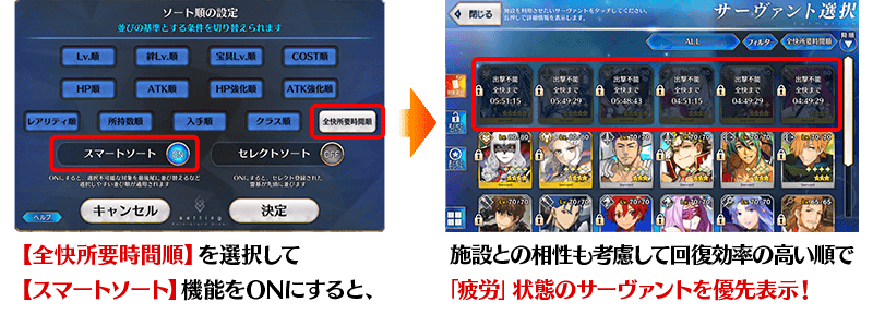 また、疲労回復をおこなうために各施設を利用する際に、「全快所要時間順」を選択して「スマートソート」機能をONにすると、施設との相性も考慮して回復効率の高い順で「疲労」状態のサーヴァントを優先表示することができます。