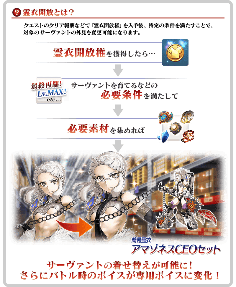 ※「★4(SR)ペンテシレイア(エルドラドのバーサーカー)」を未所持の場合、霊衣開放権は入手できますが、霊衣開放はおこなえませんのでご注意ください。