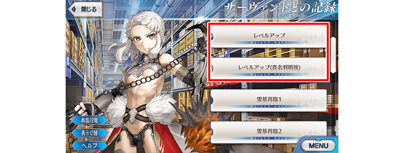 ※「仮加入」は一部サーヴァントのみ選択できます。 ※「レベルアップ」やマイルームでの会話はサーヴァントの再臨段階を指定して閲覧することができます。