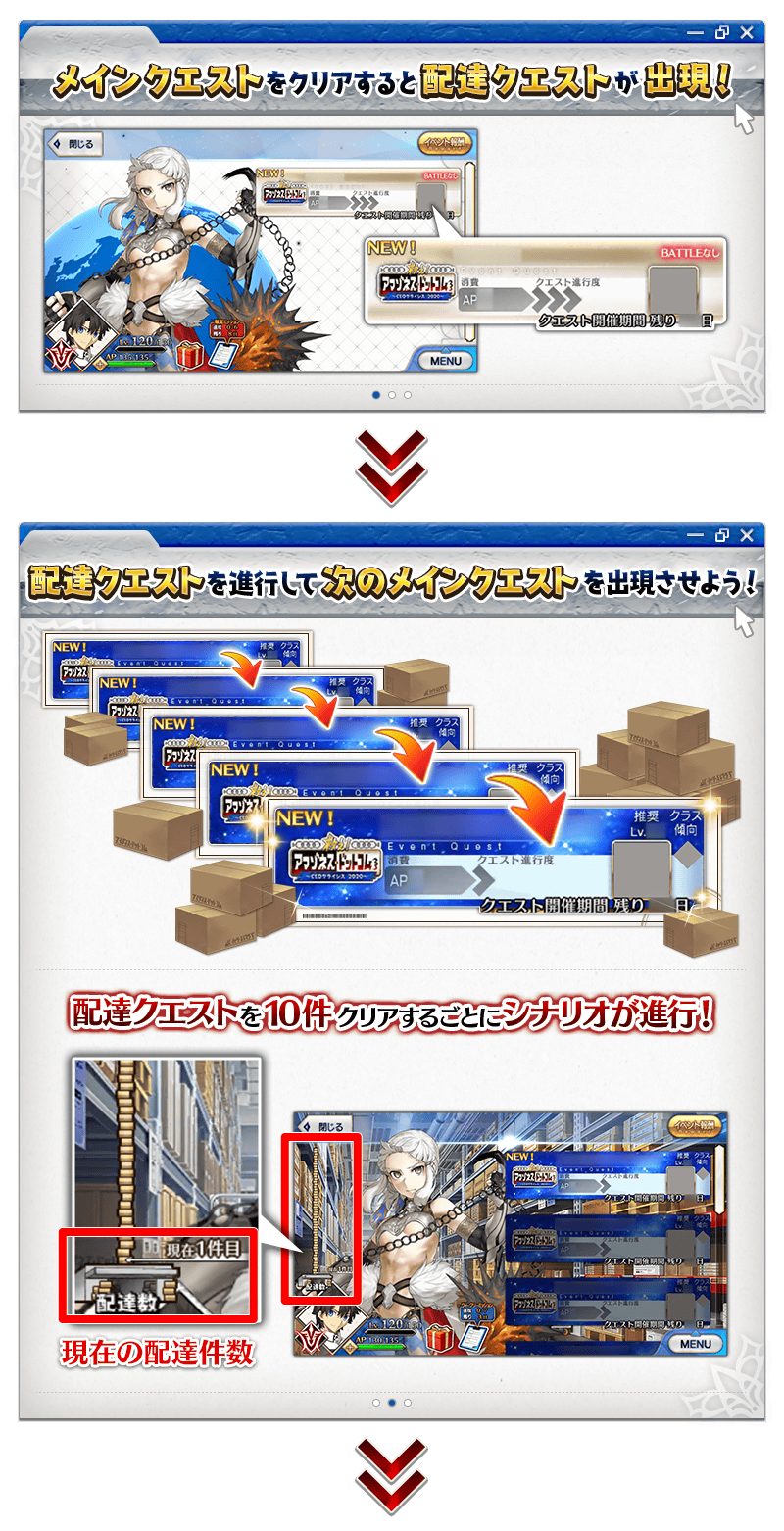 本イベントでは、アマゾネス・ドットコムの配達クエストをサーヴァント総動員で攻略していくと、ストーリーが楽しめるメインクエストが進行していきます。
