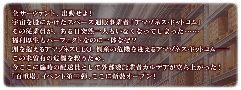 期間限定イベント「救え! アマゾネス・ドットコム ~CEOクライシス2020~」開催!サーヴァント総動員で挑む「配達クエスト」を攻略してアマゾネス・ドットコムを立て直しましょう!