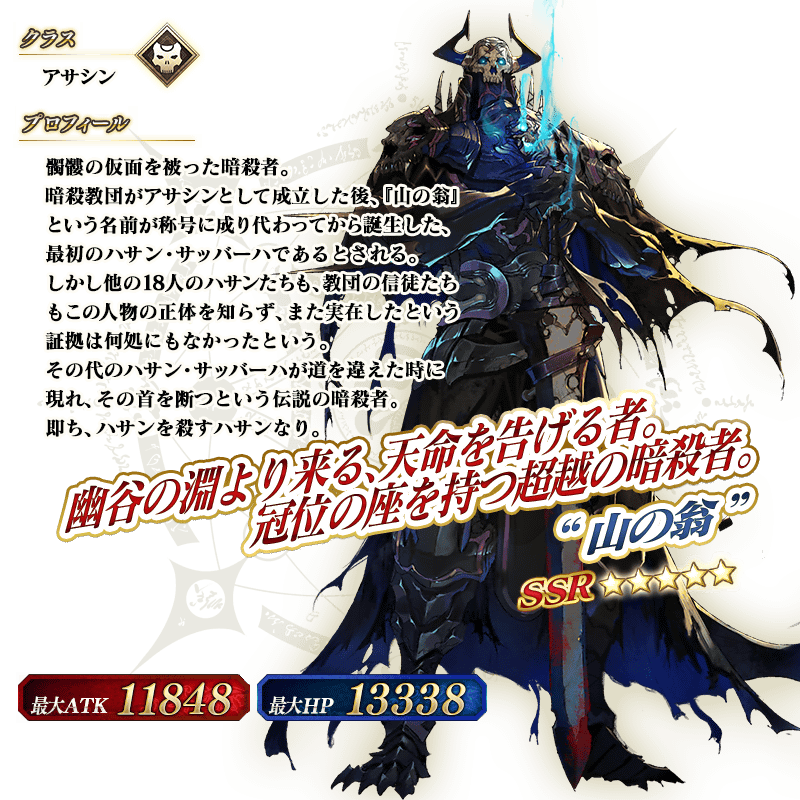 ※上記の「★5(SSR)“山の翁”」のイラストは霊基再臨第2段階のものです。