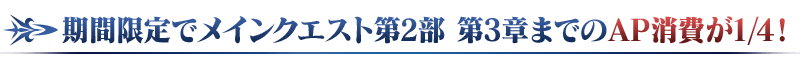下記の期間中、メインクエスト第2部 第3章までのAP消費量が1/4になります!(バトルにおいて撤退した場合でも同様の消費量になります)
