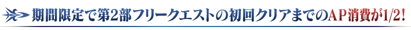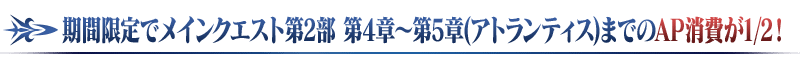下記の期間中、メインクエスト第2部(第4章から第5章(アトランティス)まで)のAP消費量が1/2になります!(バトルにおいて撤退した場合でも同様の消費量になります)