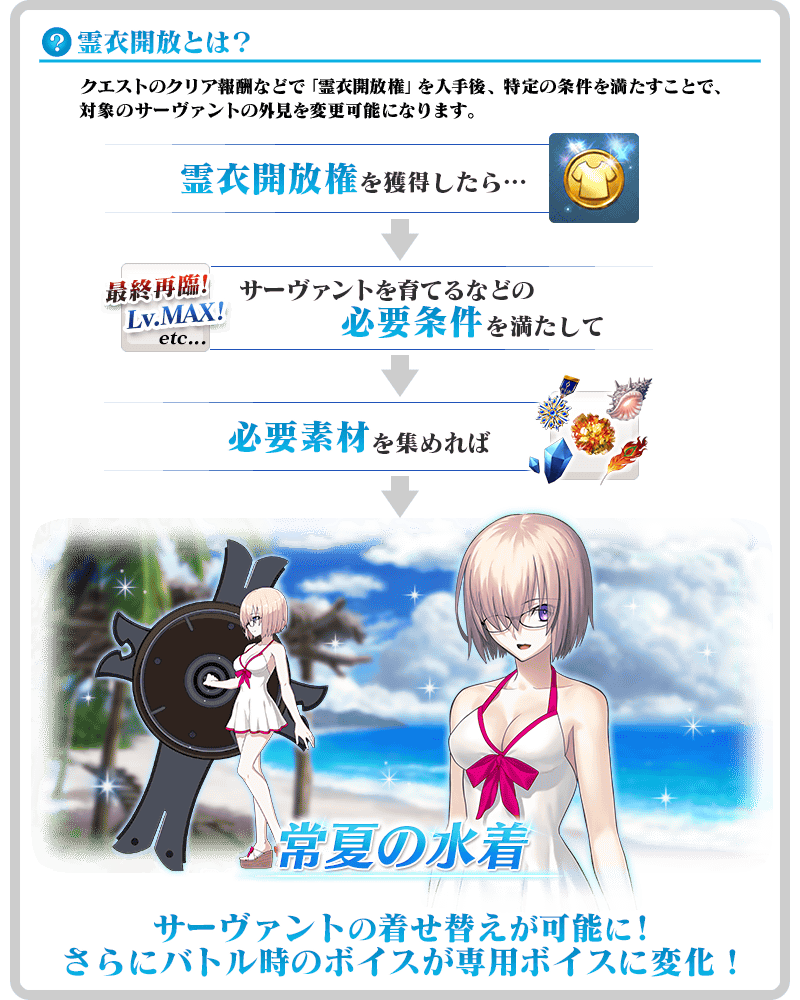 ※「レアプリズムを交換」に追加される霊衣「常夏の水着」開放権獲得クエストは恒常となり、交換期限はありません。 ※すでに交換対象の霊衣開放権を獲得されている方については、交換することができません。