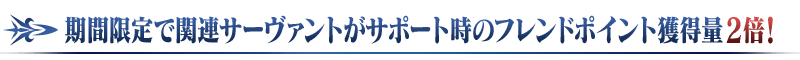 下記の期間中、クエスト開始時のサポート選択画面にて、サポートに他のマスターの関連サーヴァントを選択した場合と、他のマスターが自身の関連サーヴァントをサポートに選択した場合、フレンドポイントの獲得量が2倍になります。この機会にフレンドポイントをたくさん入手しましょう!