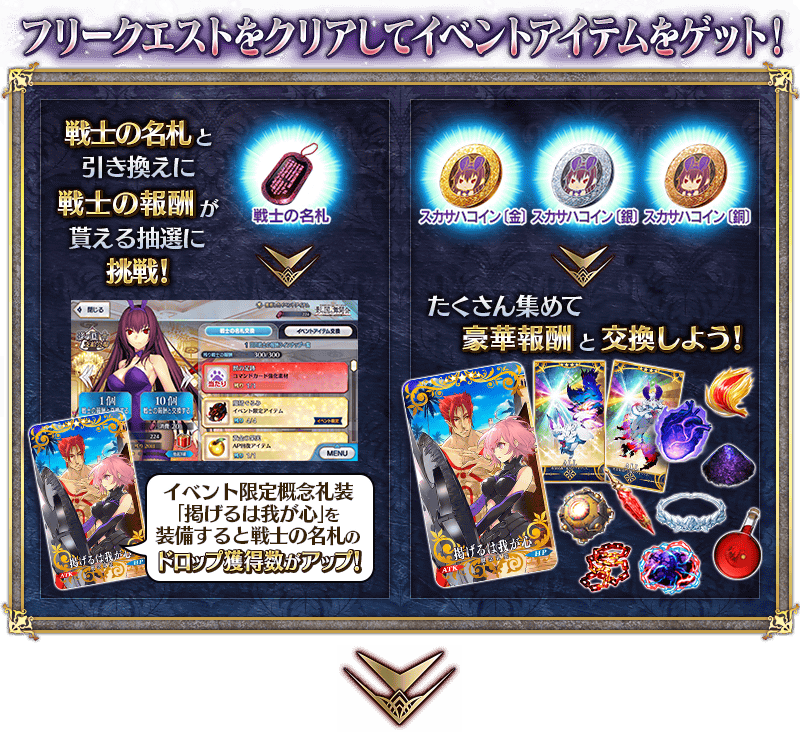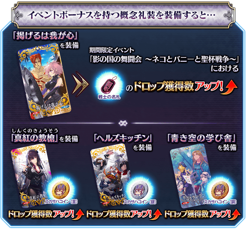 イベントアイテム交換で入手できるイベント限定概念礼装「★5(SSR)掲げるは我が心」を装備することで、イベントアイテム「戦士の名札」のドロップ獲得数がアップします。