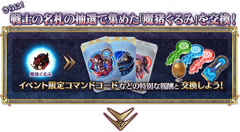※戦士の報酬にあるイベントアイテム「魔猪ぐるみ」は、集めることでイベント限定コマンドコードなど、豪華アイテムと交換できます。 ※11回目以降では、当たりアイテムおよび「黄金の果実」「白銀の果実」は補充されません。 ※交換期間終了後「戦士の名札」は消滅します。