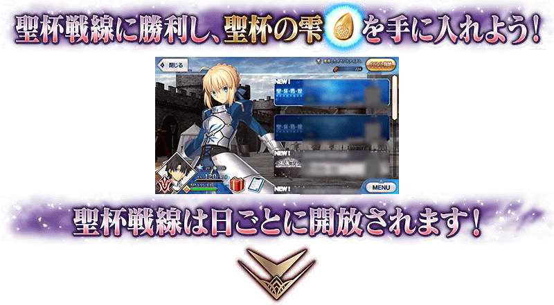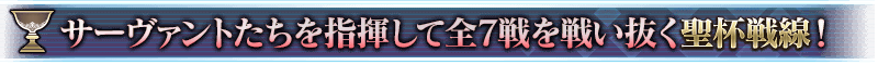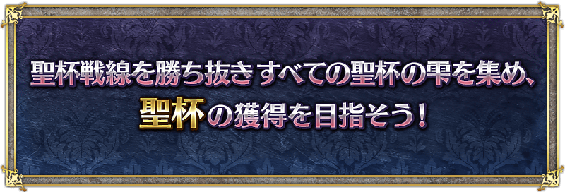 聖杯戦線は、敵味方に分かれたマスターとサーヴァントが、専用のバトルフィールドでバトルを繰り広げ、勝敗を争います。勝利することで聖杯の雫を1つ入手でき、7つ集めることで聖杯と交換可能になるので、すべての戦いを勝ち抜き、聖杯の獲得を目指しましょう!