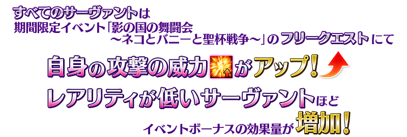 ※「自身の攻撃の威力がアップ」のイベントボーナスの効果量は、サーヴァントのレアリティによって異なります。 ※「自身の攻撃の威力がアップ」のイベントボーナスは、期間限定イベント「影の国の舞闘会 ~ネコとバニーと聖杯戦争~」のフリークエストにおいてのみ発動します。聖杯戦線では発動されませんので、あらかじめご注意ください。