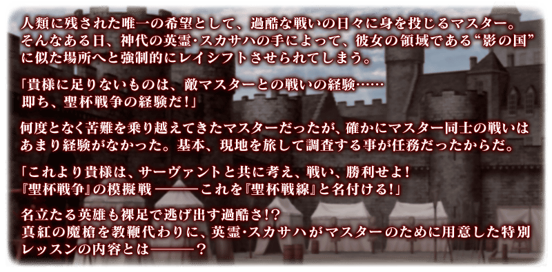 英霊・スカサハの領域たる“影の国”にて、マスターのために用意された特別レッスンがスタートします!