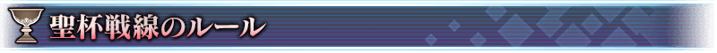 ※聖杯戦線のクリア報酬、戦利品、マスターEXP、魔術礼装EXP、絆ポイントを獲得できるのは初回クリア時のみです。 ※聖杯戦線で発生するバトルはミッションの達成条件に含まれません。 ※聖杯戦線は、開放されているものであれば任意の順番でプレイすることが可能です。 ※聖杯戦線を開戦した場合、その戦いが終わるまでは「強化」「召喚」等、聖杯戦線以外のことはできませんのであらかじめご注意ください(バトルの途中でも「戦線離脱」を選択して聖杯戦線の選択画面に戻ることはできますが、聖杯戦線はやり直しとなります)。 ※「戦線離脱」を選択して聖杯戦線の選択画面に戻った場合、聖杯戦線開始時に消費したAPは戻ってきませんのでご注意ください。