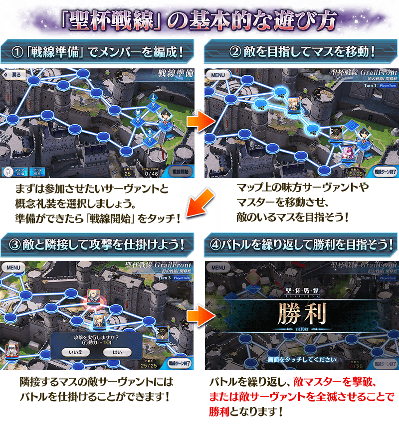 互いのターンを交互に繰り返し、敵マスターを撃破、または敵サーヴァントを全滅させることで、勝利となります。