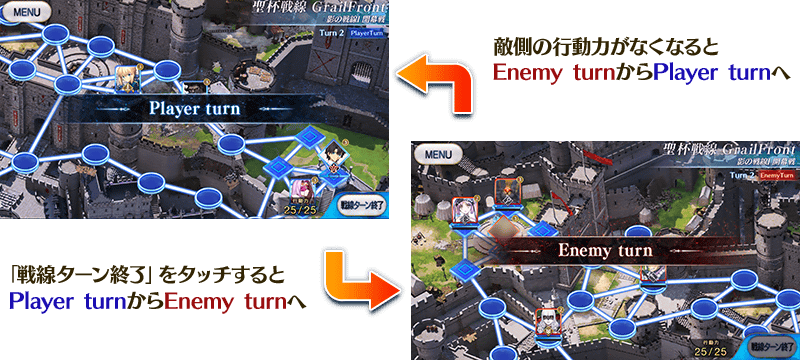 Player turn、Enemy turnともに、毎ターン開始時に全回復する行動力を消費してマスターやサーヴァントが移動や攻撃をおこない、行動力がなくなる、または画面右下の「戦線ターン終了」をタッチすることでターンが終了します。