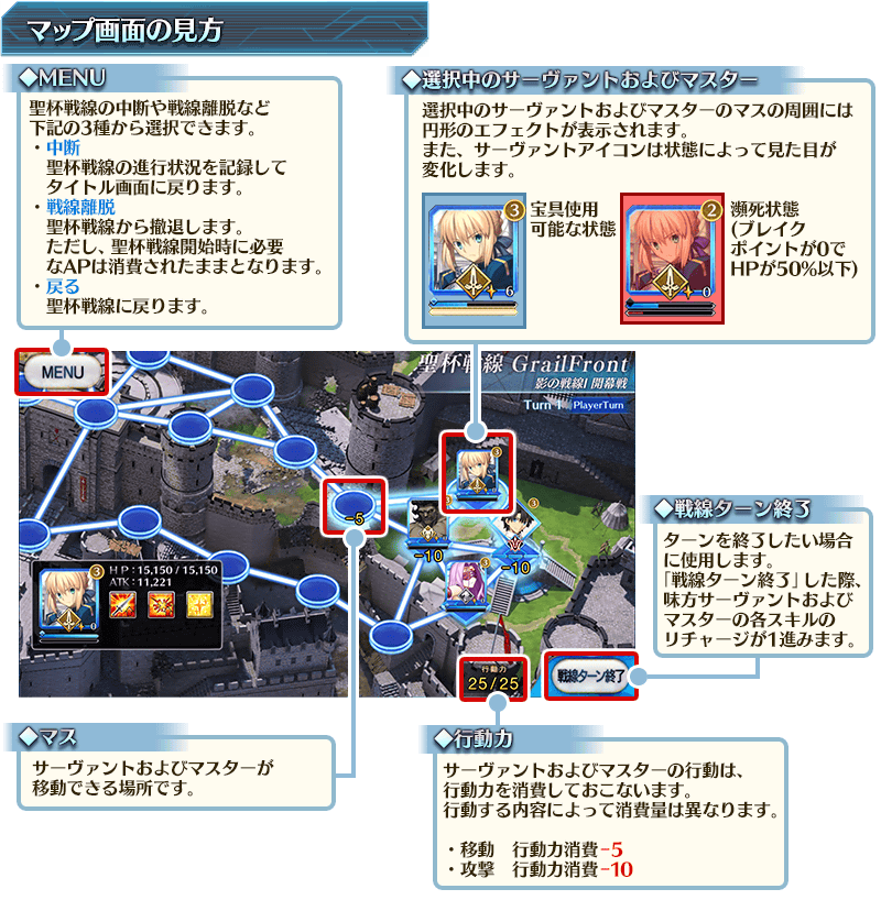聖杯戦線はマップ上のサーヴァントとマスターを行動させて進めていきます。マップ上でできる行動と消費する行動力は基本的に同じですが、サーヴァントとマスターで攻撃できる相手や勝敗に関わる条件など、それぞれ特徴が異なっています。