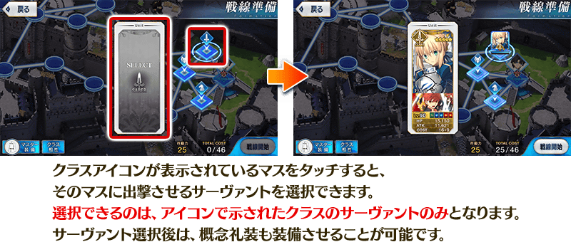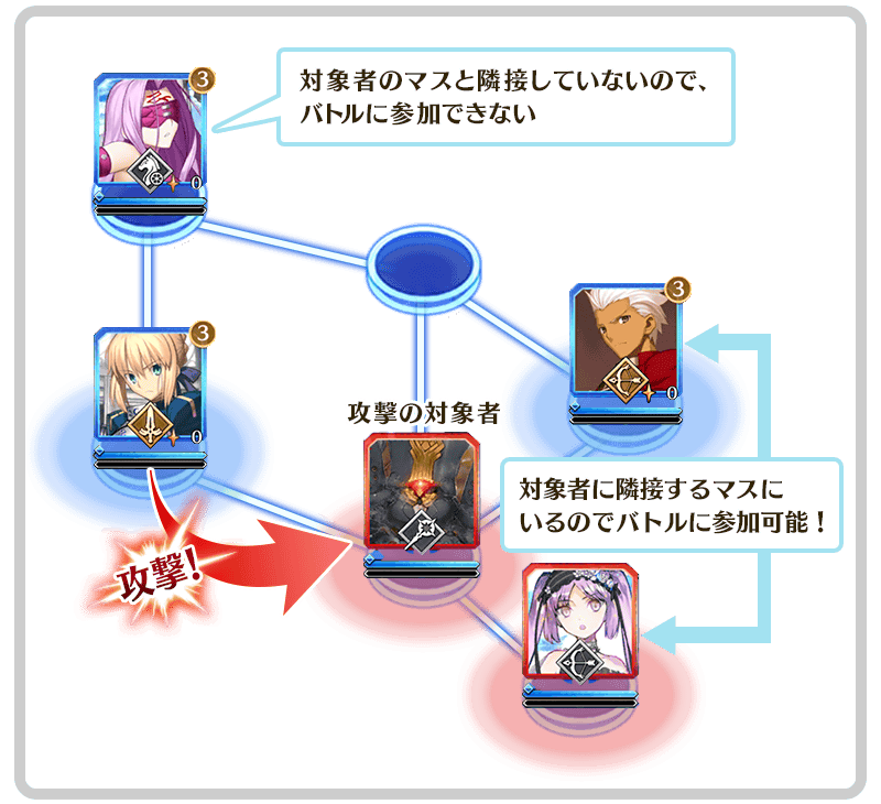 また、バトル発生時に攻撃を受けた対象と隣接するマスにサーヴァントが配置されていた場合、それらのサーヴァントもバトルに参加します。
