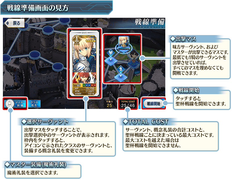 聖杯戦線では、まず初めに「戦線準備画面」で、マスターの装備する魔術礼装や出撃するサーヴァントを選択します。聖杯戦線ごとにTOTAL COSTが決まっているため、コスト内に収まるよう編成しましょう。最低でも1騎のサーヴァントを出撃させていれば、すべての出撃マスを埋めなくても開戦できます。