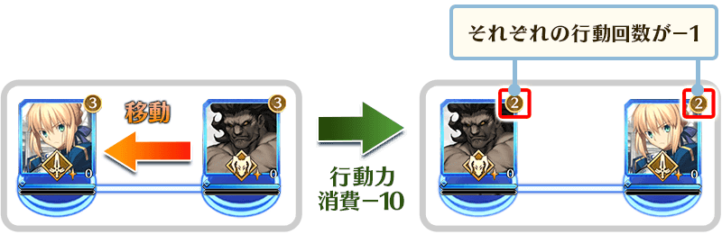 入れ替えをおこなうと2騎が移動したこととなり、この際は行動力を10消費し、サーヴァントの行動回数もそれぞれ-1されます。