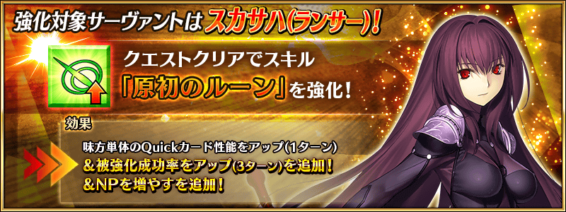 「★5(SSR)スカサハ(ランサー)」が強化される特別なクエスト「サーヴァント強化クエスト」が、カルデアゲートに恒常的に追加されます。