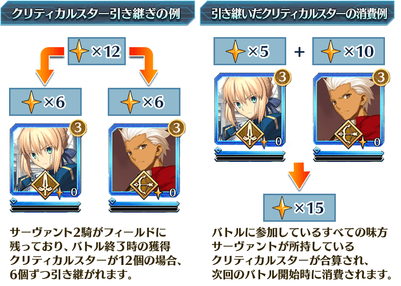 バトル終了時までに獲得して消費されなかったクリティカルスターは、バトル終了時にフィールドに残っているサーヴァントに均等に引き継がれます。このクリティカルスターは、次回のバトル開始時に消費されます。