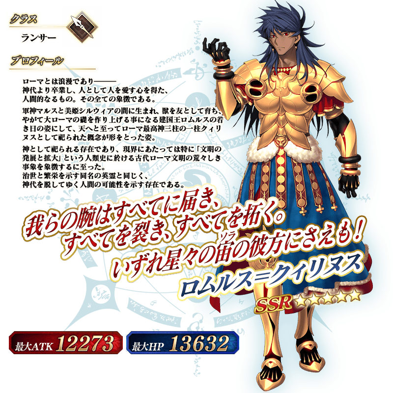 ※上記の「★5(SSR)ロムルス=クィリヌス」のイラストは霊基再臨第2段階のものです。