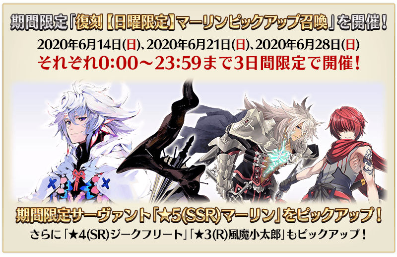| 6/14(日) 0:00~23:59 | ★5 マーリン ★4 ジークフリート ★3 風魔小太郎 |