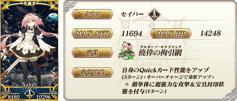 ★5 アストルフォ(セイバー) ★4 アシュヴァッターマン ★4 アストルフォ(ライダー) ★4 ナーサリー・ライム |