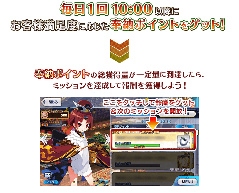 そして、お客様満足度と同じ値の「奉納ポイント」を1日1回獲得でき、その総獲得量に応じたミッションを達成することでストーリーが開放されていきます。