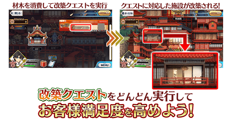 このクエストを実行することで『閻魔亭』の施設が改築され、お客様満足度がアップしていきます。お客様満足度は奉納ポイントの獲得量に影響しており、改築を進めるほど多くの奉納ポイントを獲得できるようになります。
