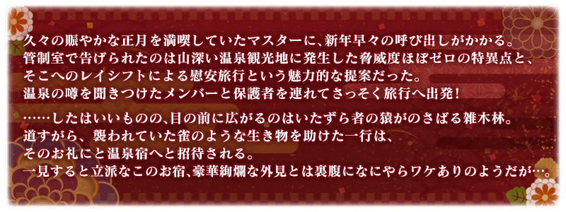 ※期間限定概念礼装「★5(SSR)笑顔のしるし」「★4(SR)正月の神秘」「★3(R)慎ましき豚」は「復刻 雀のお宿の活動日誌ピックアップ召喚(日替り)」で排出されます。詳細はこちらをご確認ください。