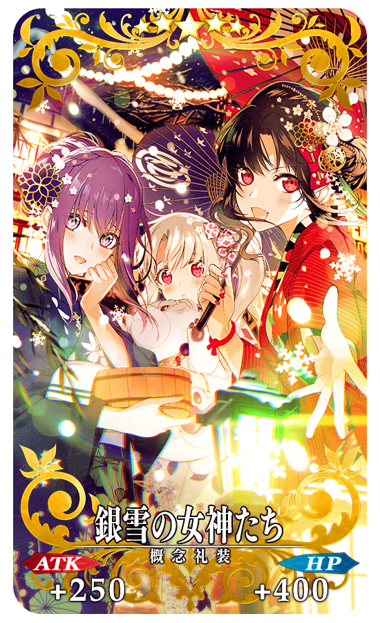 イベントアイテム交換にて入手できるイベント限定概念礼装「銀雪の女神たち」を装備することで、イベントアイテム「ケヤキの材木」「ヒノキの材木」「スギの材木」それぞれのドロップ獲得数がアップします。