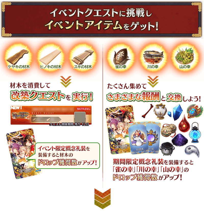 本イベントでは、イベントアイテム「ケヤキの材木」「ヒノキの材木」「スギの材木」を消費して実行する改築クエストが発生します。